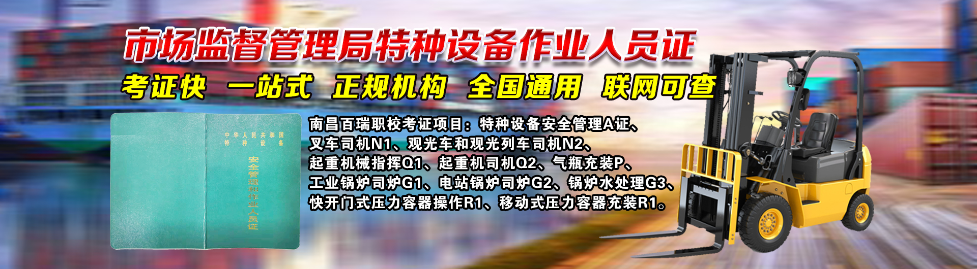 叉车(夹抱)司机N1考证 桥门式起重机司机Q2考证 特种设备安全管理(A)考 快开门式压力容器(R1) 气瓶充装 (P)考证 起重机械指挥Q1考证