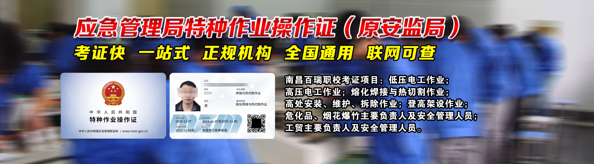 熔化焊接与热切割作业考证 低压电工作业考证 高压电工作业考证 高处安装、维护、拆除作业 登高架设作业考证 企业主要负责人和安全生产管理人员 烟花爆竹经营单位考证 危化品生产经营单位主要负责人和安全员 金属非金属矿山(小型露天) 烟花爆竹产品涉药作业 制冷与空调设备运行操作作业考证 制冷与空调设备安装修理作